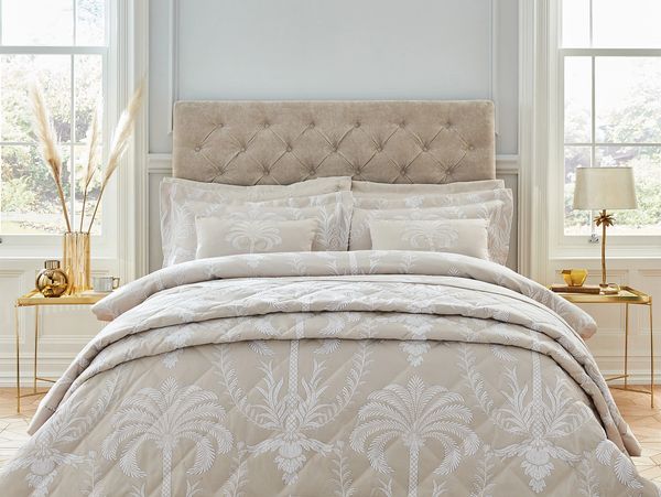 Beautifully embroidered, the soft champagne canvas plays host to a stunning palm tree design in coordinating versatile hues. The luxurious design is woven into the fabric, rather than simply being printed on, giving it a subtle sense of depth, as well as long-lasting clarity that will elevate your bedroom