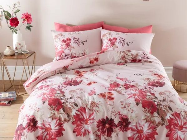 Showcasing cascading Dahlias and Chrysanthemums flowers gracefully drifting across a soft tone pink base with contrasting darker shade reverse. Soft and comfortable in pure, breathable cotton, this duvet cover set is fully reversible so you can switch up your bed style when you desire.